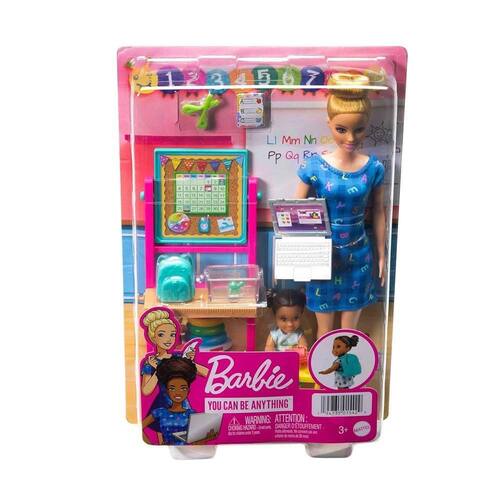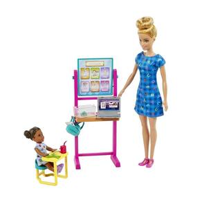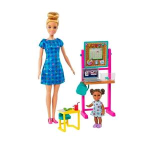 Explore um mundo de diversão com o conjunto Barbie Professora que permite às crianças explorarem suas aspirações de carreira. A Barbie loira/29 cm usa um vestido com letras do alfabeto, sapatos com tiras cor-de-rosa, um adorável penteado com coque alto e está pronta para ensinar O conjunto vem com um quadro giratório que traz duas lições, uma mochila, uma boneca criança cabelos castanhos , uma mesa para a criança, uma tesoura, uma ficha de alunos e um refresco para dar vida à narrativa. Até uma tartaruga de estimação frequenta as aulas E, com o seu notebook, a Barbie está preparada para ajudar os estudantes virtualmente também. As crianças vão adorar experimentar a carreira de professor e explorar suas aspirações. As bonecas não ficam em pé sozinhas.
