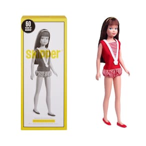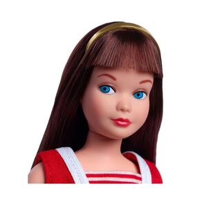 Em 1964, a Mattel nos apresentou nossa irmã mais nova favorita: Skipper. Agora, celebramos os 60 anos da irmã da Barbie com esta reprodução colecionável estilizada em sua roupa de banho listrada em vermelho, acompanhada por sapatilhas vermelhas combinando. Aparecendo pela primeira vez em um corpo Silkstone, seu rosto é emoldurado por uma franja de corte reto no estilo blunt-cut, complementada por uma faixa dourada na cabeça. Com sua etiqueta vintage e o pente e a escova brancos, assim como os que ela trouxe em sua estreia em 1964, nossa boneca Skipper é um complemento perfeito para qualquer coleção.