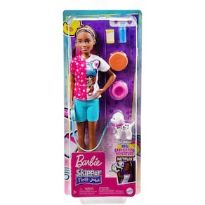 As bonecas e os conjuntos Barbie Skipper First Jobs permitem que as crianças explorem o mercado de trabalho com a irmã adolescente da Barbie. Inspirado no filme Skipper and the Big Babysitting Adventure, este conjunto constrói o currículo da boneca Skipper com o trabalho de dog walker. As imaginações podem ir longe em uma brincadeira com um adorável cachorrinho e cinco acessórios! A boneca não fica em pé sozinha. As cores e as decorações podem variar.