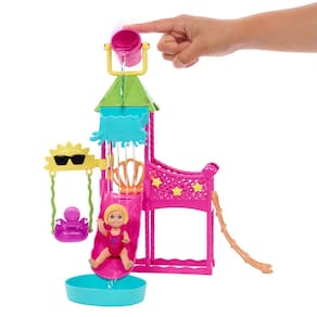 O conjunto da Barbie inclui a boneca Skipper em seu uniforme inspirado na tela, uma boneca pequena, um parque aquático de vários níveis, um brinquedo de esguicho para cachorrinhos e mais de 5 acessórios.
