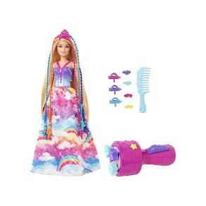 Esta boneca Barbie Princess tem mais de 20 centímetros de cabelo comprido e extensões de cabelo multicoloridas que as crianças podem se divertir trançando e torcendo usando o dispositivo incluído, para criar facilmente penteados lindos.