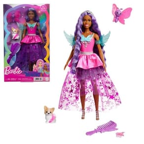 Inspirada em seu visual brilhante em Barbie Um Toque de MagiaTM, a boneca Barbie® “Brooklyn” Roberts vem com um vestido inspirado em fantasia, animais de estimação e acessórios Esta boneca Barbie® dá um toque mágico à brincadeira com o cabelo! Ela tem cabelo roxo de 18 cm de comprimento e inclui acessórios como um pente, uma faixa brilhante e um grampo decorativo A Barbie® Brooklyn usa um vestido em camadas com detalhes em asas no decote Sua longa saia de tule brilha com estrelas, enquanto as mangas brilhantes lhe dão asas e realçam seu visual mágico!