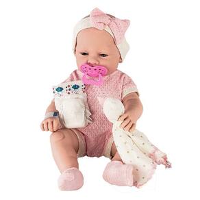 A boneca conta com: 01 - Chupeta 01 - Tiara com laço 01 - Naninha de bichinho 01 - Meias 01 - Fralda 01 - Certidão de nascimento 01 - Pulseira de maternidade