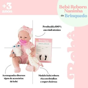 Boneca Bebê Anjo Naninha Com Acessórios Boneca Bebê estilo Reborn. Produzido em 100% em vinil atóxico, olhos fixos, tamanho e expressão de um bebê de verdade. Muito macia, gostosa de abraçar e tem um cheirinho de bebê delicioso. Além disso possuem lindos acessórios tudo para tornar sua brincadeira mais divertida, a criançada poderá soltar a imaginação e deixar a brincadeira muito mais agradável. *Acompanha Pulseira de maternidade, chupeta, tiara com laço, naninha de bichinho, meias, fraldinha e certidão de nascimento. -Não Recomendável para menores de 03 anos por conter partes pequenas que podem ser engolidas. ESPECIFICAÇÕES: Material: Polietileno, Vinil e Roupa em Tecido Dimensões: Alt.: 42cm x Larg.: 17cm Peso: Aprox. 545g