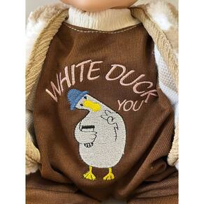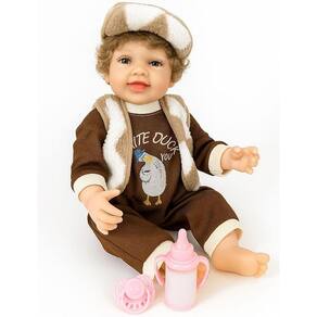 Encante-se com essa adorável boneca bebê realista, perfeita para presentear ou colecionar! Com aproximadamente 40cm de altura, ela possui traços detalhados, cabelo cacheado, olhos expressivos e um sorriso encantador. Vestida com um conjunto de inverno super fofo – macacão marrom com estampa de pato, colete de pelúcia e boina combinando – a boneca ainda acompanha mamadeira e chupeta rosa, tornando a brincadeira ainda mais completa e divertida.