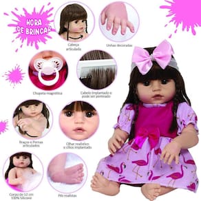 A nossa empresa tem a missão de garantir a total satisfação de seus clientes, onde a qualidade e o atendimento excepcional são nossa prioridade Estamos muito felizes em apresentar a Boneca Bebê Reborn para você, um item cuidadosamente selecionado para atender às suas necessidades. Compre agora e experimente a diferença em comprar com a nossa loja.A Boneca Bebê Reborn é o sonho das meninas Produzida 100% em vinil siliconado, essa boneca pode sentar, deitar e fazer tudo que a sua imaginação deixar. Com seus olhos castanhos e detalhes realistas ela é encantadora e apaixonante. Sua criança merece a melhor qualidade de bebê reborn Marca: Cegonha Reborn DollsModelo: Boneca Bebê Reborn Cor: BegeMaterial: Vinil Siliconado AtóxicoCaracterísticas Principais: Membros Articulados, Corpo de Silicone, Detalhes Realistas.Medidas Aprox.: Altura da Boneca: 52cm Peso Aprox. Da Boneca: 0,745 Kg Certificado INMETRO Recomendado para crianças maiores de 03 anosConteúdo:1 Bebê Reborn Cabeça, Membros e Corpo de Vinil 1 Vestido1 Par de Cílios1 Par de Brinco1 Chupeta 1 Mamadeira Simples5 Certificados3 Fraldas1 Laço Cetim2 Presilhinha1 Par de Luvas1 Bolsa Maternidade1 Prendedor de ChupetaKit Pente e Escova SimplesGarantia30 dias de garantia oferecida pelo fabricante.Dúvidas Frequentes:1. Ela acompanha ItensR. Sim, todos os itens da descrição.2. Ela emite algum somR. Não, ela não emite nenhum som.3. Pode dar banho na bonecaR. Sim, pois o material do corpo é de Silicone.4. Pode escolher a cor dos olhos da bonecaR. Não, os olhos já vêm de fábrica.Tags: Boneca, Bebe, Reborn, Realista, Menina, Infantil, Silicone, Princesa, Linda, Morena, Loira, Fofa, Banho, Enxoval, Completo, Grande, Baby Alive.Homologação Inmetro: 00717/2021-BRINQ-2