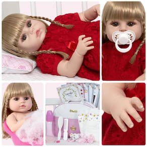 O enxoval da Boneca Bebê Reborn Realista Menina Loira é completo e acompanha diversos itens para tornar a brincadeira ainda mais divertida. Além da boneca, o kit inclui: 1 vestido, 1 par de cílios, 1 par de brinco, 1 chupeta, 1 mamadeira simples, 5 certificados, 3 fraldas, 1 laço de cetim, 2 presilhas, 1 par de luvas, 1 bolsa maternidade e 1 kit de pente e escova simples.