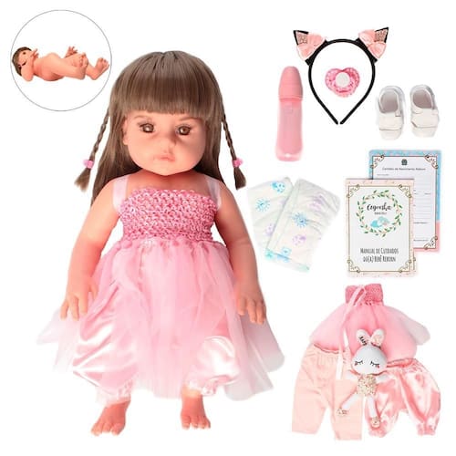 conteúdo: - 01 bebê reborn cabeça, membros e corpo de vinil - 01 conjunto de roupa de bailarina - 01 arquinho de gatinho - 01 mamadeira - 01 chupeta magnética - 01 sandalinha - 01 coelhinho de pelúcia - 01 fralda