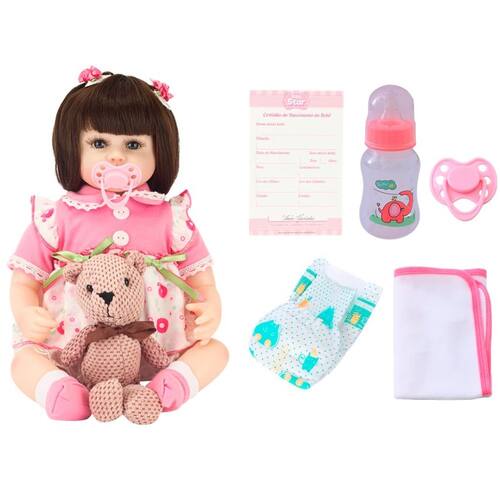 Essa linda boneca realista bebê reborn é o presente perfeito para qualquer criança! Ela tem 42cm de altura, corpo todo revestido em silicone (o que permite banhos), repleto de detalhes marcantes e realistas que vão tornar a brincadeira ainda mais imersiva. Os cabelos da bebê reborn são de fio de nylon suave, macios e de aparência idêntica aos fios humanos, os olhos são de cores vívidas e vão instigar ainda mais a imaginação dos pequenos! A bebê reborn pandinha acompanha mamadeira, chupeta magnética, um conjunto de pijamas e coelho de pelúcia.
