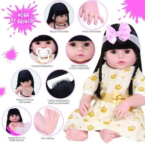 A Boneca Bebê Reborn é o sonho das meninas Produzida 100% em vinil siliconado, essa boneca pode sentar, deitar e fazer tudo que a sua imaginação deixar. Com seus olhos castanhos e detalhes realistas ela é encantadora e apaixonante. Sua criança merece a melhor qualidade de bebê reborn