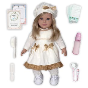 Linda Bebê Reborn Larinha; Conta com pintura no rosto; Tem cílios de verdade; É o molde nacional de reborn mais vendido; Tem 53cm, pesando aproximadamente 2kg, com Corpo de tecido; Totalmente articulada e de excelente qualidade; Cabelo implantado em fibra sintética, com olhos azuis e membros de vinil siliconizado. A bebê segue acompanhada dos 20 vinte acessórios abaixo: - 02 roupinhas sendo 01 conjuntinho tipo pijaminha - calça e blusa cor rosa + 1 roupinha modelo da foto do anúncio ou muito semelhante ; - 01 boina; - 01 lacinho; - 02 chupetas magnéticas decorada com strass; - 01 escova decorada de cristais ou pérolas; - 01 pente decorado de cristais e/ou pérolas; - 01 manta bordada; - 01 sapatinho de malha; - 01 mamadeira grande decorada de strass com LEITE FALSO; - 04 fraldas descartáveis; - 01 foto grande da bebê; - 01 Certidão de nascimento; - 01 Cartão de vacinação; - 01 Manual de cuidados; - 01 bolsa maternidade.Certificado INMETRO CE-BRI/IQB-167Homologação Inmetro: 08845-01/2021
