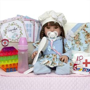 Conteúdo: - 01 Bebê Reborn Cabeça, Membros e Corpo de Vinil - 01 Conjunto de Roupa Florido Azul - 01 Mamadeira - 01 Escova de Cabelo Decorada - 01 Pente Decorado - 01 Chupeta Magnética - 01 Certidão de Nascimento - 01 Manual de Cuidados - 01 Certidão de Vacinas - 01 Exame do Pézinho - 01 Prendedor de Chupeta - 01 Kit com 3 Fraldas - 01 Kit Médico - 01 Pop it - 01 Bolsa Maternidade - 01 Laço de Cabelo