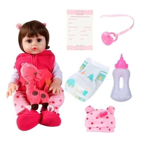 1x Mamadeira; 1x Chupeta; 1x Certidão de Nascimento; 1x Fralda; 1x Conjunto de roupa; 1x Girafa de pelúcia; 1x Touca de cabelo; 1x Par de acessório de cabelo.