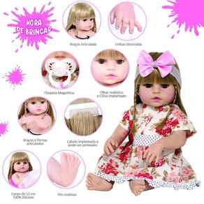 A nossa empresa tem a missão de garantir a total satisfação de seus clientes, onde a qualidade e o atendimento excepcional são nossa prioridade Estamos muito felizes em apresentar a Boneca Bebê Reborn para você, um item cuidadosamente selecionado para atender às suas necessidades. Compre agora e experimente a diferença em comprar com a nossa loja.A Boneca Bebê Reborn é o sonho das meninas Produzida 100% em vinil siliconado, essa boneca pode sentar, deitar e fazer tudo que a sua imaginação deixar. Com seus olhos castanhos e detalhes realistas ela é encantadora e apaixonante. Sua criança merece a melhor qualidade de bebê reborn Marca: Cegonha Reborn DollsModelo: Boneca Bebê Reborn Cor: BegeMaterial: Vinil Siliconado AtóxicoCaracterísticas Principais: Membros Articulados, Corpo de Silicone, Detalhes Realistas.Medidas Aprox.: Altura da Boneca: 52cm Peso Aprox. Da Boneca: 0,745 Kg Certificado INMETRO Recomendado para crianças maiores de 03 anosConteúdo:1 Bebê Reborn Cabeça, Membros e Corpo de Vinil 1 Vestido1 Par de Cílios1 Par de Brinco1 Chupeta 1 Mamadeira Simples5 Certificados3 Fraldas1 Laço Cetim2 Presilhinha1 Par de Luvas1 Bolsa Maternidade1 Prendedor de ChupetaKit Pente e Escova SimplesGarantia30 dias de garantia oferecida pelo fabricante.Dúvidas Frequentes:1. Ela acompanha ItensR. Sim, todos os itens da descrição.2. Ela emite algum somR. Não, ela não emite nenhum som.3. Pode dar banho na bonecaR. Sim, pois o material do corpo é de Silicone.4. Pode escolher a cor dos olhos da bonecaR. Não, os olhos já vêm de fábrica.Tags: Boneca, Bebe, Reborn, Realista, Menina, Infantil, Silicone, Princesa, Linda, Morena, Loira, Fofa, Banho, Enxoval, Completo, Grande, Baby Alive.Homologação Inmetro: 00717/2021-BRINQ-2