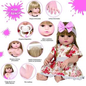 A nossa empresa tem a missão de garantir a total satisfação de seus clientes, onde a qualidade e o atendimento excepcional são nossa prioridade Estamos muito felizes em apresentar a Boneca Bebê Reborn para você, um item cuidadosamente selecionado para atender às suas necessidades. Compre agora e experimente a diferença em comprar com a nossa loja.A Boneca Bebê Reborn é o sonho das meninas Produzida 100% em vinil siliconado, essa boneca pode sentar, deitar e fazer tudo que a sua imaginação deixar. Com seus olhos castanhos e detalhes realistas ela é encantadora e apaixonante. Sua criança merece a melhor qualidade de bebê reborn Marca: Cegonha Reborn DollsModelo: Boneca Bebê Reborn Cor: BegeMaterial: Vinil Siliconado AtóxicoCaracterísticas Principais: Membros Articulados, Corpo de Silicone, Detalhes Realistas.Medidas Aprox.: Altura da Boneca: 52cm Peso Aprox. Da Boneca: 0,745 Kg Certificado INMETRO Recomendado para crianças maiores de 03 anosConteúdo:1 Bebê Reborn Cabeça, Membros e Corpo de Vinil 1 Vestido1 Par de Cílios1 Par de Brinco1 Chupeta 1 Mamadeira Simples5 Certificados3 Fraldas1 Laço Cetim2 Presilhinha1 Par de Luvas1 Bolsa Maternidade1 Prendedor de ChupetaKit Pente e Escova SimplesGarantia30 dias de garantia oferecida pelo fabricante.Dúvidas Frequentes:1. Ela acompanha ItensR. Sim, todos os itens da descrição.2. Ela emite algum somR. Não, ela não emite nenhum som.3. Pode dar banho na bonecaR. Sim, pois o material do corpo é de Silicone.4. Pode escolher a cor dos olhos da bonecaR. Não, os olhos já vêm de fábrica.Tags: Boneca, Bebe, Reborn, Realista, Menina, Infantil, Silicone, Princesa, Linda, Morena, Loira, Fofa, Banho, Enxoval, Completo, Grande, Baby Alive.Homologação Inmetro: 00717/2021-BRINQ-2