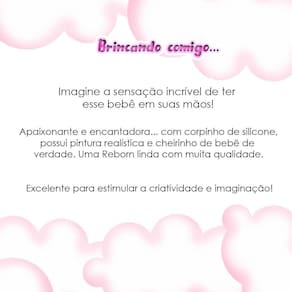 A Boneca Bebê Reborn é o sonho das meninas Produzida 100% em vinil siliconado, essa boneca pode sentar, deitar e fazer tudo que a sua imaginação deixar. Com seus olhos castanhos e detalhes realistas ela é encantadora e apaixonante. Sua criança merece a melhor qualidade de bebê reborn