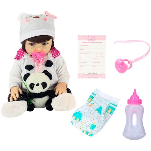 1x Mamadeira; 1x Chupeta; 1x Certidão de Nascimento; 1x Fralda; 1x Conjunto de roupa; 1x Panda de pelúcia; 1x Par de acessório de cabelo; 1x Touca.