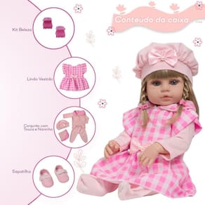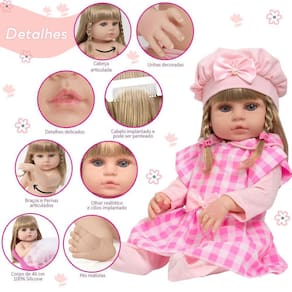 Tags: Boneca Reborn, Menina, Realista, Tipo Barbie, Acessórios, Vinil Siliconado, Membros Articulados, Corpo de Silicone, Detalhes Realistas.