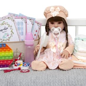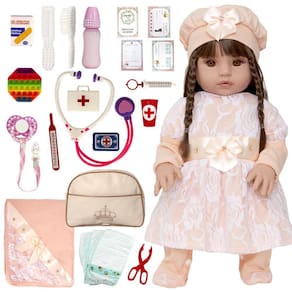 A Boneca Bebê Reborn é a preferida das meninas Produzida 100% em vinil siliconado, essa boneca pode sentar, deitar e fazer tudo que a sua imaginação deixar. Com seus olhos castanhos e cabelos implantados ela é encantadora e apaixonante. Ter um bebê reborn nos braços é uma experiência muito agradável, pois ela oferece grande conforto ao toque e muito realismo com seus traços delicados, a beleza e riqueza de seus detalhes. Sua criança merece a melhor qualidade de bebê rebornConteúdo:- 01 Bebê Reborn Cabeça, Membros e Corpo de Vinil - 01 Conjunto de Roupa Salmão- 01 Mamadeira- 01 Escova de Cabelo Decorada- 01 Pente Decorado- 01 Chupeta Magnética- 01 Certidão de Nascimento- 01 Manual de Cuidados- 01 Certidão de Vacinas- 01 Exame do Pézinho- 01 Prendedor de Chupeta- 01 Kit com 3 Fraldas- 01 Kit Médico- 01 Pop it- 01 Bolsa Maternidade- 01 Laço de CabeloMedidas Aprox.: - Altura da Boneca: 52cm- Peso Aprox. Da Boneca: 0,745 Kg - Recomendado para crianças maiores de 03 anos Homologação Inmetro: ABCP-BRI-0058-2021-17