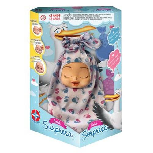 Assim como os Chá Revelação em que os pais descobrem o sexo do bebê na vida real, aqui a criança também pode viver um pouco dessa magia. O Bebê Surpresa vem envolto em uma fralda, com olhos fechados e sem saber o sexo, somente a cor da pele. Passando um algodão com água nos olhos, descobre-se a cor dentre as 4 opções possíveis. Uma vez que a cor dos olhos foi descoberta, os olhos ficam abertos. Ao tirar a fralda, descobre-se o sexo entre feminino e masculino. É ai que começa a vida de um novo bebê para ser cuidado com muito carinho pela criança. Ainda vem acompanhado de uma chupeta. sendo surpresa quando você compra. O Bebê Surpresa é indicado para crianças a partir dos 3 anos.