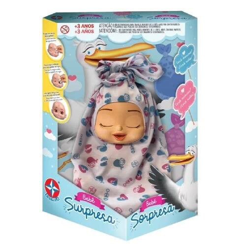 Boneca bebê surpresa - estrela as meninas vão adorar se divertir com a boneca bebê surpresa da estrela assim como nos chá de revelação, em que os pais descobrem o sexo do bebê na vida real, aqui a criança também poderá viver e curtir um pouco dessa magia. O bebê surpresa da estrela vem envolto em uma linda fralda, com os olhos fechados e sem saber qual é o sexo, sendo possível ver somente a cor da pele. Quando você passa um algodão com água nos olhinhos da boneca, você descobre a cor dentre as 4 opções possíveis. Uma vez que a cor dos olhos foi descoberta, os olhos ficam abertos. Ao tirar a fraldinha, descobre-se também o sexo do bebê. E é ai que começa a vida de um novo bebê para ser cuidado com muito amor e carinho pela criançada. Além disso, ele vem acompanhado de uma chupeta. São mais de 10 variações diferentes do bebê, sendo surpresa quando você compra. Idade recomendada: acima de 3 anos de idade.