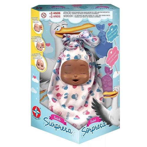 Assim como no Chá Revelação em que os pais descobrem o sexo do bebê na vida real, com a boneca Bebê Surpresa da Estrela, a criança também pode viver um pouco dessa magia. O Bebê Surpresa vem envolto em uma fralda, com olhos fechados e sem saber o sexo, somente a cor da pele. Passando um algodão com água nos olhos, descobre-se a cor dentre as 4 opções possíveis. Uma vez que a cor dos olhos foi descoberta, os olhos ficam abertos. Ao tirar a fralda, descobre-se o sexo entre feminino e masculino. É ai que começa a vida de um novo bebê para ser cuidado com muito carinho pelo pequeno. Ainda vem acompanhado de acessórios. Sortimento: As cores e modelos podem variar sem opção de escolha.