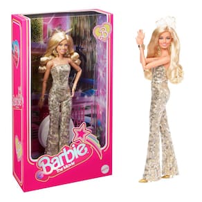 Saudações da Barbie Land! Esta boneca Barbie colecionável brilha em um macacão de discoteca com lantejoulas inspirado no look de sua personagem em Barbie The Movie. Cabelos grandes de discoteca, joias metálicas e saltos dourados completam seu conjunto cintilante. À semelhança de Margot Robbie como Barbie, ela é um ótimo presente para fãs e colecionadores! Suporte para bonecas incluído. A boneca não pode ficar sozinha. As cores e as decorações podem variar.