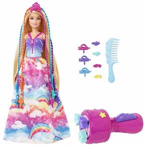 BONECA COM ACESSÓRIOS - BARBIE DREAMTOPIA - PRINCESA TRANÇAS MÁGICAS - MATTEL: estimule a diversão de criar histórias e fazer penteados com a Barbie Dreamtopia Princesa com aparência de contos de fadas e cabelos extralongos e multicoloridos com mais de 20 cm. As jovens estilistas podem criar os looks dos seus sonhos com a boneca Barbie Princesa Tranças Mágicas, que apresenta cabelo extra longo, extensões de arco-íris que as crianças podem torcer e trançar com uma ferramenta que torna o penteado fácil e divertido. Penteie o cabelo da boneca Barbie, depois conecte duas ou três contas de cabelo na ferramenta especial de modelagem e crie penteados fantásticos com o pressionar de um botão. Personalize o visual de princesa da boneca Barbie com presilhas coloridas e uma tiara e, em seguida, leve-a em uma aventura encantada. INFORMAÇÕES: - Produto: Barbie Princesa Tranças Mágicas - Marca: Mattel - Coleção: Barbie Dreamtopia - Tipo: Boneca com Acessórios - Tamanho: 30 cm de altura - Conteúdo: 1 Boneca, 1 ferramenta de pentear e 8 acessórios - Recomendação: para crianças a partir de 3 anos de idade ESPECIFICAÇÕES: - Referência: GTG00 - Embalagem (C x A x L): 26 x 32 x 07 cm - Embalagem (Kg): 0.410 - Material / Composição: Plástico e tecido - Certificado: CE-BRI/INNAC-00128-04A-NM-300/2002 BENEFÍCIOS DE BRINCAR: - Eleva a autoestima - Estimula o raciocínio - Exercita o imaginário - Desenvolve a criatividade - Promove a socialização e interação - Desenvolvimento neuropsicológico - Estimula habilidades motoras básicas - Incentiva a comunicação e linguagem - Desenvolve aspectos emocionais e afetivos AVISO: - As imagens são meramente ilustrativas - Os pesos e medidas são aproximados - As cores e estampas dos produtos podem ter variações - As informações são de responsabilidade do fabricante ou fornecedor ATENÇÃO: - Comprar Barbie Dreamtopia - Princesa Tranças Mágicas - Mattel é fácil - Condições de pagamento facilitadas - Entrega para todo o Brasil - Oferta válida por tempo limitado ou enquanto durarem os estoque