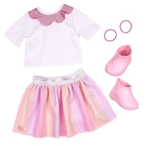 Além disso, a Boneca Coralyn da Our Generation vem com os seguintes itens inclusos: 1 blusa, 1 saia, 1 par de sapatos e 1 par de elásticos de cabelo.
