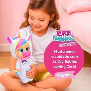 As novas Cry Babies Loving Care sao bebes adoraveis! Permite que as criancas cuidem como se fosse um bebe de verdade. Loving Care Dreamy possui 26cm de tamanho e acompanha novos acessorios como fraldinha, mamadeira e chupeta. Nao possui funcao eletrica e nao necessita de pilhas, chora quando pressiona a sua cabeca!