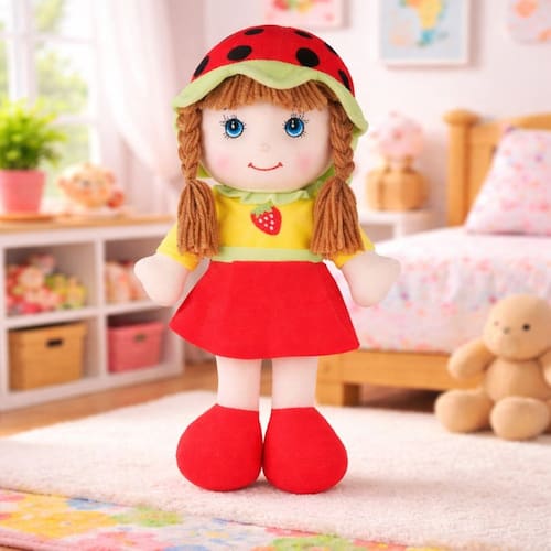Uma bonequinha de pano cheia de doçura e encanto Com seu toque macio e uma roupinha delicada, a Boneca Morango conquista corações e transforma qualquer momento em pura imaginação. Perfeita para estimular o carinho, a criatividade e criar histórias cheias de fantasia. Um pedacinho de afeto em forma de brinquedo!