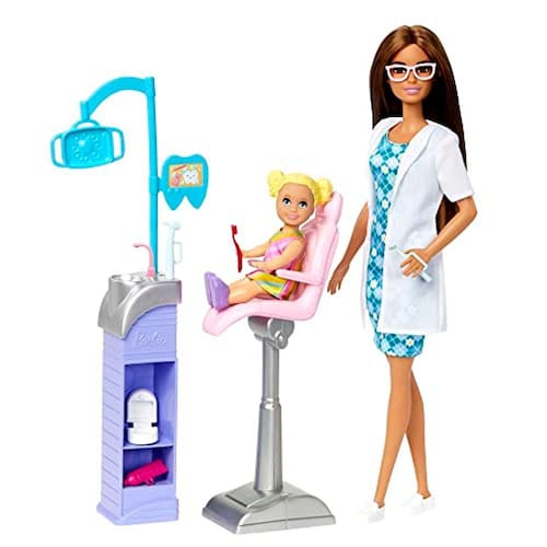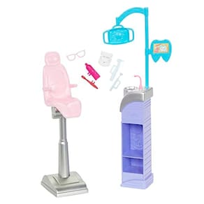 PRODUTO INTERNACIONAL. A boneca Barbie Dentist está pronta para alegrar os sorrisos! Este brinquedo da clínica odontológica inclui duas bonecas, uma cadeira de exame, um posto odontológico e acessórios menores, como ferramentas odontológicas, escova e pasta de dentes para que as crianças possam ajudar a boneca Barbie a cuidar de seu adorável paciente. As crianças podem sonhar alto e imaginar tudo o que podem se tornar com as bonecas Barbie Career! Boneca não pode ficar sozinha. As cores e decorações podem variar.
