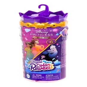 Cada boneca é um mistério até que seja adicionada água, ativando a tecnologia Color Reveal. Será uma princesa ou um vilão Mais cinco surpresas incluem um anel e uma pulseira com joias para a criança, um baú de tesouro e peças de brincar com temas de personagens