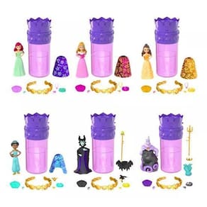 Cada boneca é um mistério até que seja adicionada água, ativando a tecnologia Color Reveal. Será uma princesa ou um vilão Mais cinco surpresas incluem um anel e uma pulseira com joias para a criança, um baú de tesouro e peças de brincar com temas de personagens
