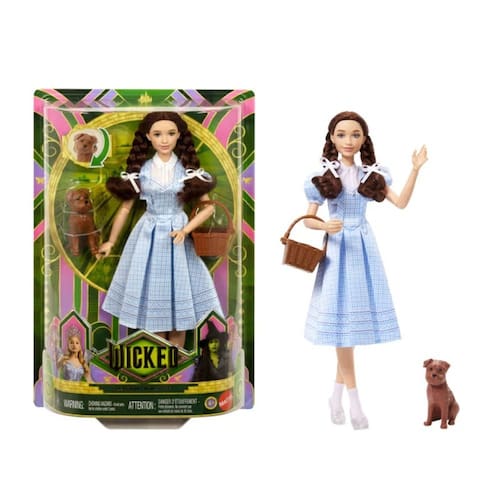Todos os caminhos levam a Oz com a boneca Dorothy Gale de Wicked: For Good, da Universal Pictures! Assim como no filme, a pequena fazendeira veste seu icônico vestido xadrez. Seu cachorro, a cestinha característica e os sapatos de salto combinam perfeitamente com a roupa removível. O longo cabelo castanho da boneca Dorothy Gale, trançado em duas marias-chiquinhas, completa o visual lendário.