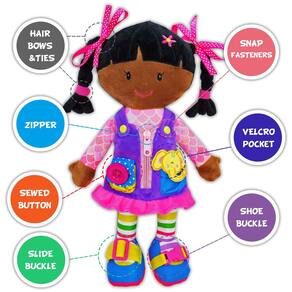Aí vem a Scarlett da Dressy Friends! Com uma variedade de acessórios de vestir embutidos, a boneca de pelúcia fofa e educativa é um presente perfeito para crianças pequenas e pré-escolares a partir de 2 anos. Com 7 atividades principais de vestir, Scarlett mantém seus filhos ocupados praticando habilidades enquanto brincam. Seus bebês primeiro aprenderão a reconhecer esses botões coloridos, zíperes, tiras, cadarços e fivelas e depois praticarão abrir os bolsos, puxar os zíperes para cima e para baixo, afivelando o cinto de sapato. O brinquedo brilhante de criatividade apoia o desenvolvimento de reconhecimento de cores, habilidades motoras finas e habilidades de resolução de problemas. Diferente de pranchas tradicionais ocupadas ou outros brinquedos de fivela, o adorável brinquedo é projetado exclusivamente em forma de boneca abraçável, decorado com tecidos coloridos brilhantes e acessórios para manter seus filhos entretidos. Inspirado no método de educação Montessori, o brinquedo foi projetado para incentivar interações por meio de uma abordagem científica. A boneca ensinará seu filho a eventualmente aprender a se vestir e amarrar seu próprio laço de cabelo. Com um clipe de transporte, a adorável boneca facilmente se torna o melhor brinquedo de viagem para crianças no carro, uma ótima distração na clínica odontológica ou simplesmente uma companheira em qualquer ocasião. A boneca mede 39,4 cm de altura, um tamanho perfeito para crianças brincarem e carregarem. Um brinquedo June Garden é fabricado estritamente de acordo com os padrões ASTM e EN71. Com mais de 20 anos de experiência na fabricação de brinquedos de pelúcia, a June Garden está comprometida em projetar brinquedos de qualidade que inspirem admiração e curiosidade. Limpar apenas manchas. - Aprenda a vestir: com 7 principais atividades de vestir, a Dressy Friends Scarlett permite que seus filhos aproveitem o aprendizado praticando como encaixar, prender, fechar, fivela, zíper, laço, amarrar e muito mais enquanto brinca. - Desenvolva habilidades naturalmente: inspiradas no método Montessori de educação, as crianças aprendem mais rápido tocando e trabalhando com os materiais em vez de instrução direta. - Divertido de brincar e aprender: seus filhos vão adorar praticar puxar para cima e para baixo o zíper, abrir e fechar os botões ou prender o cinto de sapato. Através de muitas atividades divertidas, o Dressy Friends ajuda a desenvolver habilidades sensoriais e motoras. - Adequado para crianças: o adorável brinquedo de pelúcia macio vem com cores contrastantes atraentes para prender a atenção da criança por horas. O brinquedo tem 39,4 cm de altura, tamanho perfeito para seus filhos praticarem e abraçarem. Recomendado para meninas a partir de 2 anos. - Ótimo brinquedo de viagem: a boneca educativa abraçável vem com um clipe de transporte, o que a torna a companhia de viagem perfeita para seus filhos. Seu filho certamente levará a qualquer lugar durante todo o dia para aprender e explorar.