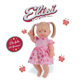 A Boneca Elisi ''O seu grande amor'', é toda delicada e rica em detalhes fofos. Fala 30 frases, estimulando a imaginação e a fala da criança. Uma experiência apaixonante e de muito carinho... ESPECIFICAÇÕES: Tamanho aproximado da boneca: 31cm Idade Recomendada: À partir de 03 anos !!! ATENÇÃO: Produto não indicado para menores de 03 anos, contém peças pequenas que podem ser engolidas. Códido de Barras: 7897020203800 Material: Vinil e Tecido em fibra Conteúdo da Embalagem: 01 Boneca Elisi Medida Aproximada da Embalagem: (A, L, C): 40x9x25cm Selo de Segurança do Inmetro: Registro 007255/2018 CE-BRI/ICEPEX-N 01262-14 OCP 0046 Certificação: Certificado pelos Órgãos Autorizados Fabricante: Adijomar
