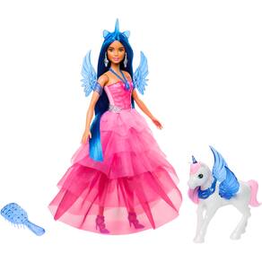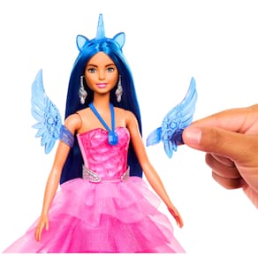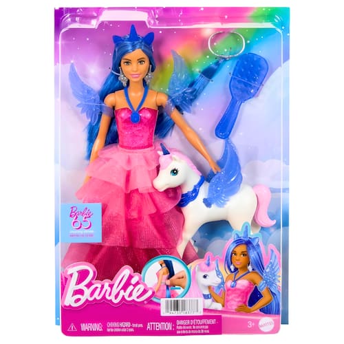 Inspirada na personagem A Touch of Magic, esta boneca é um lindo alicórnio... um unicórnio alado! A roupa da boneca inclui um top rosa perolado e saia em camadas. Seu visual radiante tem toques de azul safira em homenagem ao 65º aniversário. Os acessórios mágicos inspiram estilo e brincadeiras imaginativas: uma faixa de unicórnio, asas de safira removíveis e acessórios de encaixe. Brincos de prata e saltos azuis completam seu traje fantástico. Meninos e meninas podem pentear com a escova incluída e deixar a imaginação voar acima das nuvens. Seu alicórnio de estimação tem uma coleira azul safira e asas combinando. As crianças vão adorar sonhar com aventuras de fantasia com a boneca e seu amigo unicórnio alado.