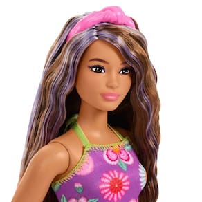 - A boneca Barbie tem corpo curvilíneo e cabelo castanho ondulado com mechas roxas. Uma faixa de cabelo rosa com nó adiciona um toque extra de cor!