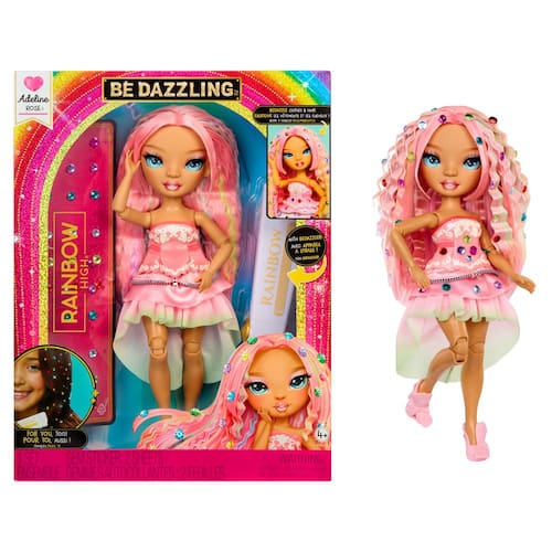 - RAINBOW HIGH SE ARRISCA A BRILHAR!: As garotas Rainbow High estão de volta e prontas para brilhar como nunca na linha Be Dazzling! Adeline Rose, a fashionista rosa suave e sonhadora, traz charme parisiense e ambição de alta costura para cada momento brilhante.