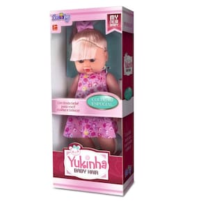 Composição: Policloreto de Vinila (Vinil), polietileno, tecido. Yukinha Baby Hair Loira Ref: 1113 Peso Boneca: 0,310 Kg Tamanho Boneca: 35cm C x L x A (Embalagem): 16,5x09x41,5 cm Contém uma boneca. Indicado para crianças acima de 3 anos.