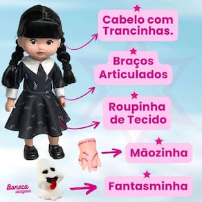 Essa boneca inspirada na Wandinha, veio para tornar suas brincadeiras ainda mais divertidas. Feita com ricos detalhes da personagem, com franjinha e roupinha toda preta, traz todo encanto e diversão que encontramos na série. A boneca tem 31cm de comprimento com corpinho emborrachado e articulado, feita em borracha macia não trás riscos em machucar a criança.