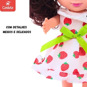 Boneca Happy c/Som Morena Vestido Moranguinho-Castela DESCRIÇÃO DO PRODUTO A Boneca Happy Life Castela é a amiga perfeita para acompanhar as crianças em momentos de afeto e imaginação. Com lindos cabelos castanhos macios e um adorável vestido com estampa de moranguinho, ela conquista pelo visual meigo e cheio de charme. Produzida com vinil e plástico de alta qualidade, essa boneca toca música ao ser ativada, tornando a brincadeira ainda mais divertida. Ideal para presentear, foi feita para ser a melhor amiga da infância e criar lembranças inesquecíveis.