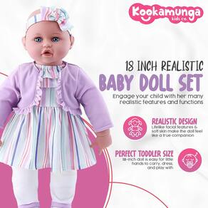 Projetado com brincadeiras imaginativas em mente Sobre nós: As bonecas e acessórios infantis Kookamunga são projetados com funções imaginativas de ilha de brincar em cada brinquedo que criamos. Sabemos o quão importante é brincar e é por isso que oferecemos uma experiência de jogo realista e cativante. Nossos conjuntos de brinquedos e bonecas são funcionais, fáceis de usar e feitos apenas com os melhores e mais duráveis materiais para que seus pequenos possam desfrutar de seus novos amigos favoritos por horas. Livre-se do tempo de tela e diga olá para estimular a brincadeira funcional! Destaques do produto divertido: aumenta a imaginação e a criatividade - A boneca infantil Kookamunga pode ajudar as crianças a construir confiança e aumentar o aprendizado e a diversão. Segurança em primeiro lugar – Nossa boneca realista com acessórios é fabricada em instalações cuidadosamente monitoradas e inspecionadas para atender aos mais altos padrões. A segurança do seu filho é nossa prioridade. Padrão de unicórnio rosa vibrante – as crianças adoram cores brilhantes e vibrantes, e nós criamos este conjunto de bonecas macias com um tema roxo de arco-íris. Ditch Technology Play - Volte à brincadeira real com o Kookamunga Kids e veja seu filho aprimorar seu aprendizado, desenvolvimento e habilidades sociais. O que está incluído? 1 boneca de bebê de 45 cm, 1 bolsa de fraldas, 1 cobertor de bebê, 1 babador, 1 mamadeira, 1 chupeta e 1 unicórnio de brinquedo de pelúcia. Aviso de segurança: Estes conjuntos de bonecas são ideais para dois anos ou mais. Nunca deixe uma criança sozinha enquanto brinca. Descubra brincadeiras divertidas e funcionais com Kookamunga Kids - Veja seus filhos brincarem por horas – Desfrute de assistir seu pequeno brincar com seu novo conjunto de bonecas por horas. A boneca macia de 45,7 cm serve para a maioria dos acessórios de boneca. Perfeito para meninas e meninos a partir de dois anos. - Conteúdo da embalagem: Na sua compra hoje, você receberá uma boneca realista de 45,7 cm com uma seleção de acessórios de boneca correspondentes. O conjunto inclui uma bolsa de fraldas, cobertor de bebê, babador, mamadeira de brinquedo, chupeta e unicórnio de brinquedo de pelúcia. - Lindo conjunto de estampa de arco-íris – Dê o presente de brincadeiras sem fim com o conjunto de bonecas e acessórios Kookamunga Kids. Cada conjunto de bonecas vem em um padrão roxo vibrante e arco-íris, tornando o presente perfeito de Natal e aniversário. - Qualidade premium – Nossas bonecas para meninas e meninos de 2 anos são feitas com material e tecidos de alta qualidade, até roupas meticulosamente personalizadas e olhos azuis. Seus filhos vão adorar esta boneca com acessórios. - Experimente a Kookamunga Kids sem riscos – os pais nos dizem: "esta boneca infantil é uma virada de jogo." "Meus pequenos adoram seu novo conjunto de bonecas Kookamunga Kids". Não se esqueça de conferir nossos outros brinquedos infantis cativantes em nossa loja.