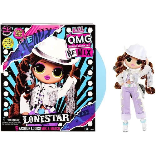 Apresentando Lonestar: Lonestar é apenas uma gurl country desde seu chapéu de vaqueira até seus esporões, e ela tem características deslumbrantes, cabelo bonito e penteado e seu próprio estilo de vaqueira. Ela está pronta para o melhor show – a turnê So Extra. Giddy Up. Vamos remisturar: Lonestar tem 2 roupas de moda country que ela traz com ela enquanto faz apresentações no palco com confiança. Misture e combine moda com sua boneca licious BFF, LOL Surprise OMG. Ela também tem sua guitarra acústica preta para se destacar. Gire antes de jogar: os ensaios são agora mais divertidos. Lonestar permite que você gire seu disco de tamanho normal para reproduzir um clipe de música no pacote. Cante com ela. As letras estão na revista que está incluída e revela a obra-prima de Lonestar. Bata uma posse: vá à passarela com confiança com Lonestar e amigos. Esta boneca LOL Surprise OMG também inclui um suporte de boneca para que ela possa levar onde quer que sua moda a leve a qualquer momento. Dica: As mãos dela são removíveis para facilitar a colocação. Colecione todas as quatro bonecas LOL SURPRESE OMG REMIX FASHION : cada uma tem seu próprio estilo de música: Country, R&B, Pop e Hip Hop. Cada pequena boneca vem com 25 surpresas incluindo 2 roupas. Misture e combine para muita diversão. (Cada boneca é vendida separadamente).