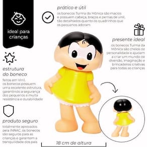 Fabricado 100% em Vinil e atóxico, os bonecos Turma da Mônica possuem uma excelente estrutura, garantindo sempre a segurança, além de serem super resistente e duráveis. Fácil de limpar e seguro, indicado para crianças a partir de 3 anos pode ser o presente ideal para criar um mundo de diversão, imaginação e brincadeiras criativas para as crianças.