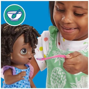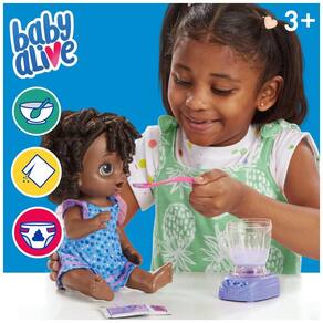 Prepare uma deliciosa guloseima de mirtilo para o seu bebê com o liquidificador de brinquedo da boneca Magical Mixer Baby Com dois pacotes de comida em pó para bonecas incluídos, basta adicionar água e misturar no liquidificador de brinquedo realista. A boneca vem com uma colher para alimentar e um pente para pentear seus lindos cabelos pretos. Ela bebe, faz xixi e cocô, e depois de alimentá la, dê lhe alguns goles de água da mamadeira. É um ótimo presente para meninos e meninas a partir de 3 anos. A roupa e o pente são removíveis e a boneca é da marca Baby Alive. O liquidificador de brinquedo funciona de verdade e é perfeito para crianças que adoram cuidar de suas bonecas.