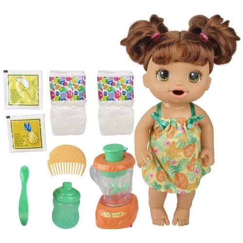 A boneca Magical Mixer Baby é perfeita para crianças a partir de 3 anos que adoram brincar de preparar guloseimas tropicais para seus bebês. Com o liquidificador de brinquedo de verdade, basta adicionar um dos dois pacotes de comida em pó para boneca incluídos e 15ml de água, pressionar o botão e misturar a comida do bebê. A boneca vem com uma colher para alimentar e um pente para pentear seus lindos cabelos castanhos. Além disso, ela bebe, faz xixi e faz cocô, proporcionando uma experiência mais realista para as crianças. Depois de terminar a comida, é só dar alguns goles de água da mamadeira. A boneca vem em um vestido removível com tema tropical e é um ótimo presente para meninas e meninos. A marca Baby Alive é uma marca registrada da Hasbro e o liquidificador de brinquedo realmente funciona.