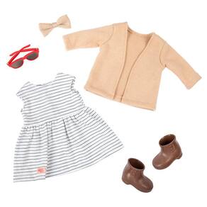 Dê a Marlow uma ajuda extra com a bengala enquanto ela viaja, e ela pode girar os braços e as pernas para trocar facilmente de roupa para combinar com cada uma de suas aventuras. Ela chega com um lindo vestido listrado com um cardigã bege longo e moderno e botas combinando. E seu grande acessório de arco de cabelo acrescenta diversão aos seus penteados!
