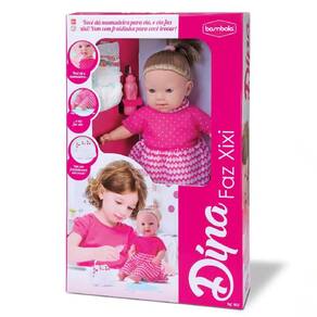 Boneca Dina Faz Xixi de Verdade – Bambola   A Boneca Dina Faz Xixi da Bambola é perfeita para deixar a brincadeira das crianças ainda mais divertida e realista. Com um design encantador, ela vem com mamadeira e fraldinha para proporcionar uma experiência completa de cuidado e imaginação.   Ao dar a mamadeira, a Dina bebe a água e faz xixi de verdade, permitindo que a criança brinque de cuidar como se fosse um bebê de verdade. Além disso, sua roupinha em tons vibrantes é super charmosa, deixando a boneca ainda mais fofa.   Informações:  - Ref.: 403 - Marca: Bambola - Modelo: Dina Faz Xixi - Material: Vinil, Tecidos e Polipropileno - Material Corpo: Pano - Acompanha mamadeira e fraldinha - Faz xixi de verdade - Tamanho ideal para brincadeiras de cuidado - Código de barras (EAN): 7899871704031 - Altura Aproximada: 42 cm - Certificação: 7789-2023-BRI-1M - Recomendado para crianças a partir de 3 anos   Conteúdo da Embalagem: - 1 Boneca - 1 Mamadeira - 1 Fralda   Uma ótima opção para incentivar a imaginação, responsabilidade e carinho das crianças.